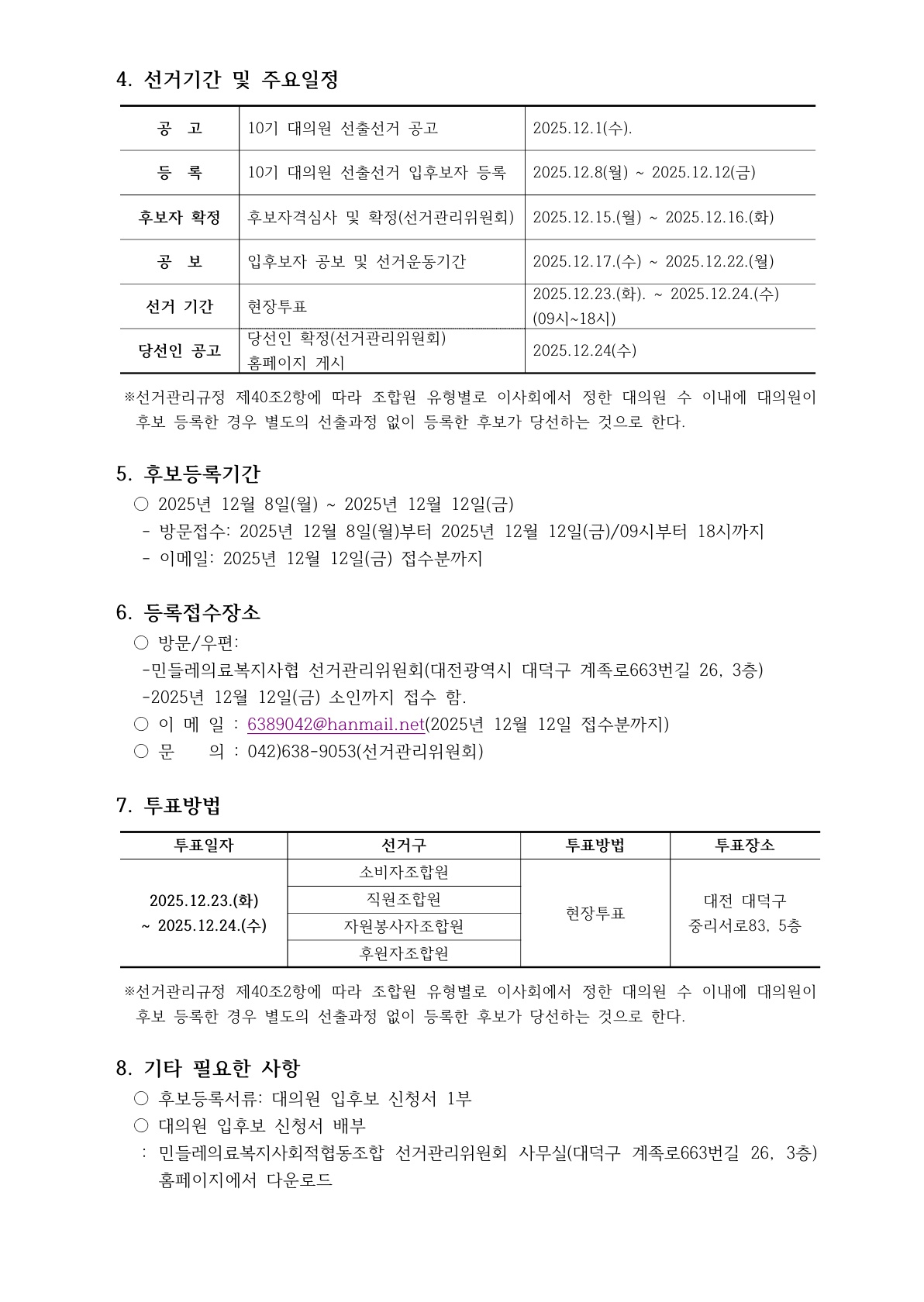 10기 대의원 선거 공고 상세내용