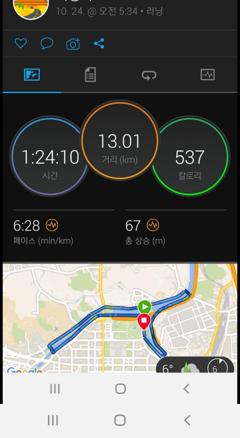 이른아침 5시30분 둔산대교 아래서 만나서 간단히 몸풀고 원촌교방향으로 갔다가 턴해서 다시 둔산대교로 골인. 13km정도 된다. 시간은 1시간 24분정도 소요됐다. 10키로에 익숙해져서 인지 아직은 13키로가 좀 힘들다. 뛰다보면 이것도 익숙해지는 거리가되고 점점 더 길게 뛰게 되는듯하다.